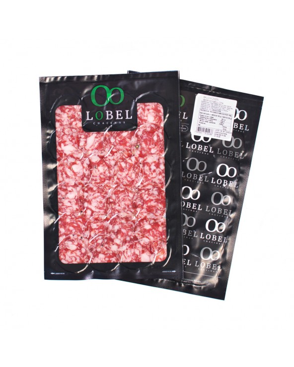 Cortado a máquina por profesionales para obtener lonchas finas y homogéneas, este producto mantiene intactas sus propiedades, aromas y jugosidad. Está embutido en tripa natural y aderezado con pimienta negra, especias y un toque justo de sal que realza su sabor suave pero persistente.